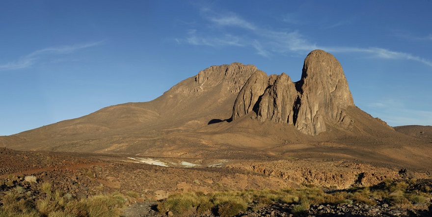 Ahaggar national park covers 450,000 sq. km in Tamanrasset Province in the central Sahara Desert. The protected area is part of the Hoggar Mountains which extend for 550,000 sq. km in southern Algeria along the Tropic of Cancer. The mountains were formed due to earthquakes and violent volcanic activity that produced basalt lava about 300 million years ago. The nature of igneous rocks are associated with the Pre-Cambrian Epoch making Hoggar one of earth’s oldest mountains. Source: World Geography Encyclopedia. Hoggar Mountains have been shaped by erosion into spectacular jagged formations including spectacular volcanic spires with a height of 300 meters, massive cliffs and fissures, deep ravines, gueltas, and queds which contain permanent oases.